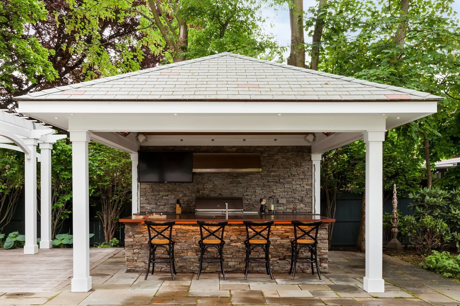 A landscape professional can assess the available space to give you the most expansive structure where you can place outdoor furniture in a conversational grouping and have an outdoor TV where the kids can watch their favorite shows on a summer night.